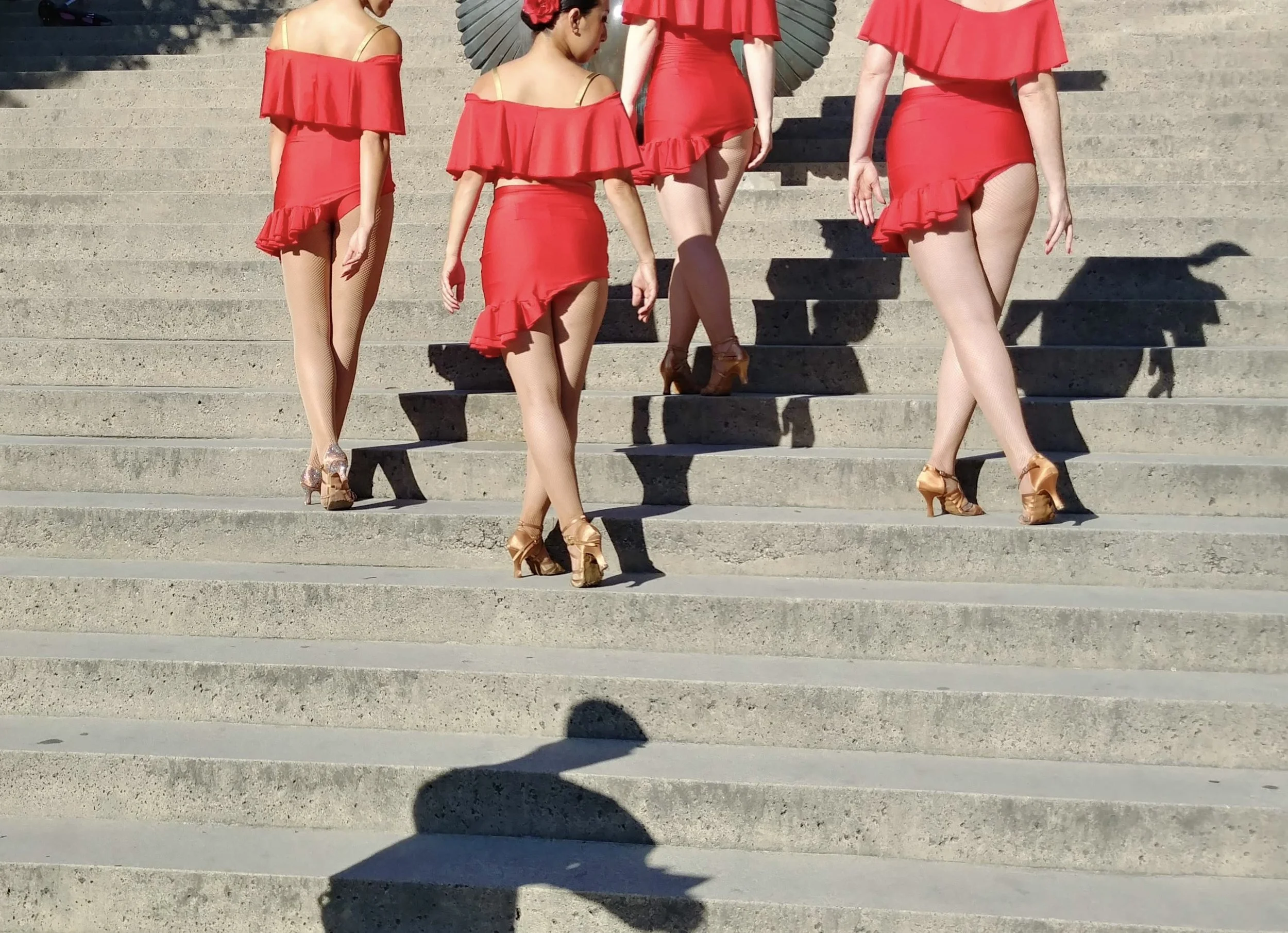 Wear bare feet, jazz shoes, or indoor sneakers. After the warm-up, you'll be invited to change into Latin ballroom heels – up to 2.5 inches is recommended for beginners. You will need a tan pair for year end performance. Toes n Taps on Cook Street is a great local option, or try Montreal-based online store Salsa Style.